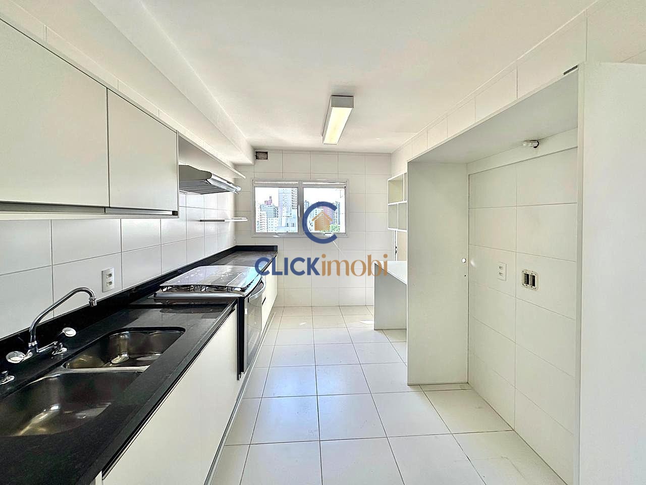 Cozinha ampla , clara , rica em armários , fogão e coifa instalados , ótima área de serviço com entrada independente e banheiro de funcionários.