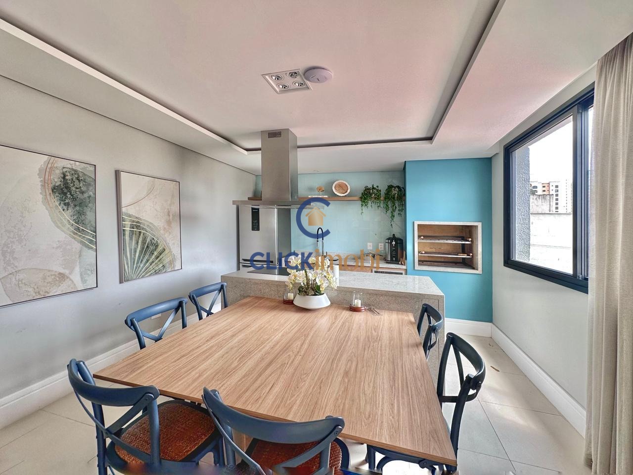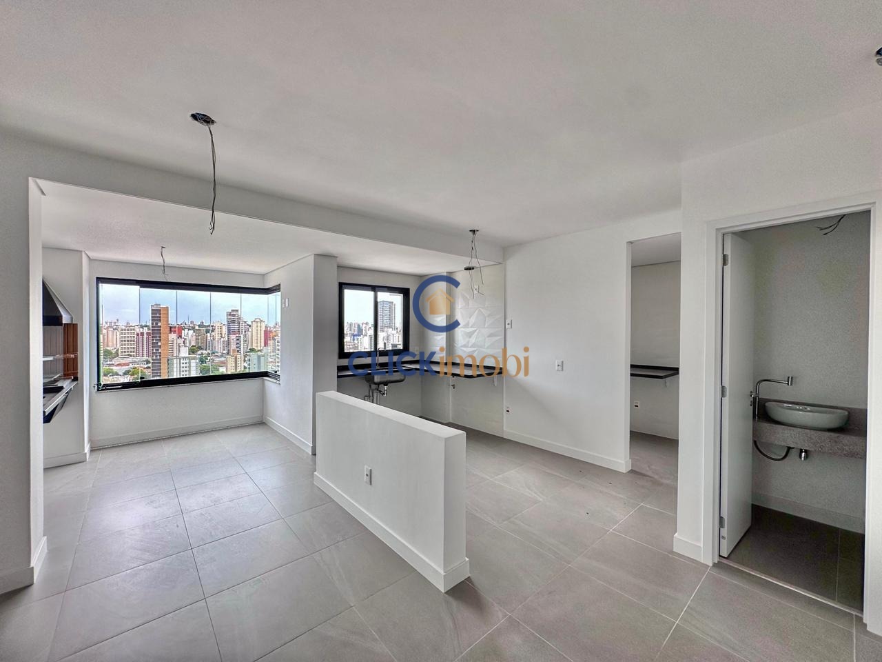 Living para 2 ambientes, lavabo e varanda gourmet com churrasqueira a carvão.