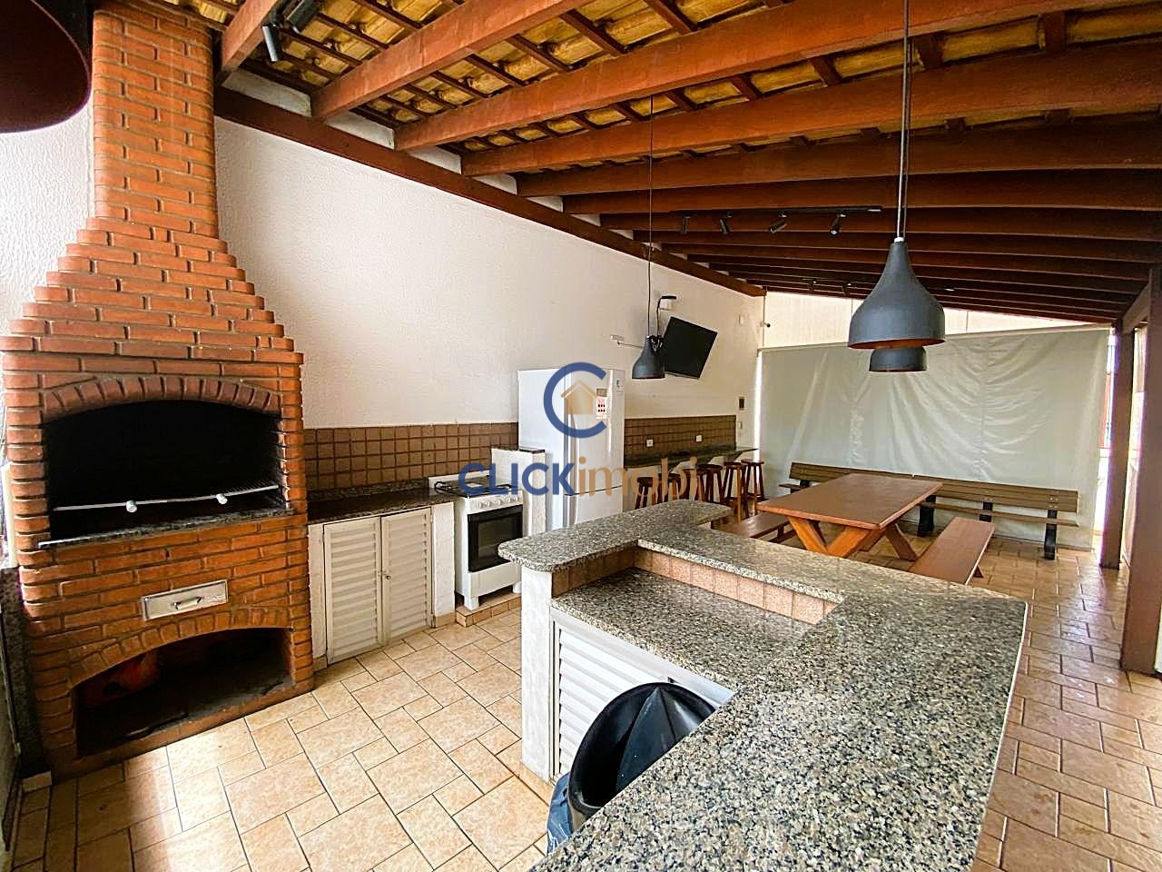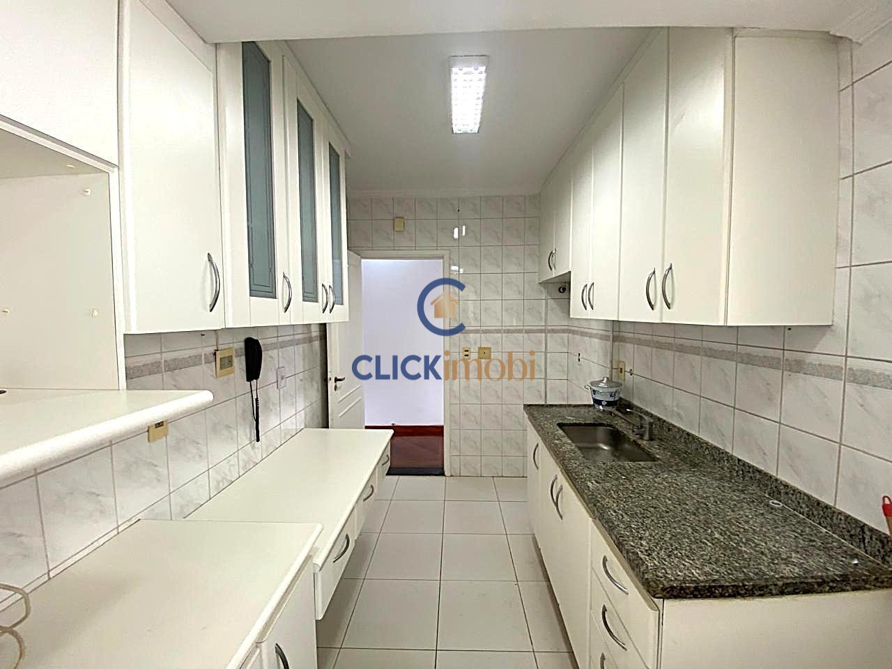A cozinha é ampla e bem iluminada, com móveis planejados, integrada à área de serviço com armários e varal de teto.