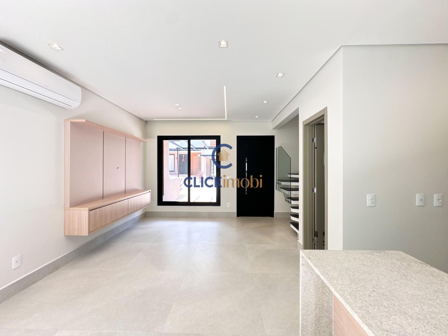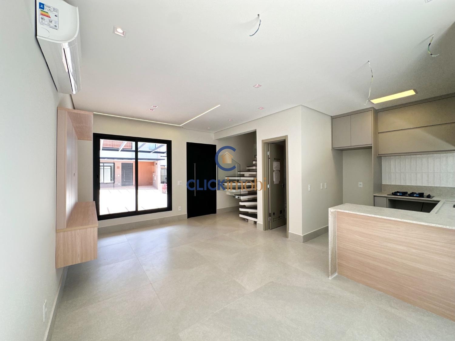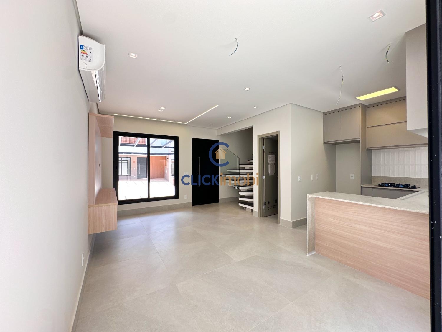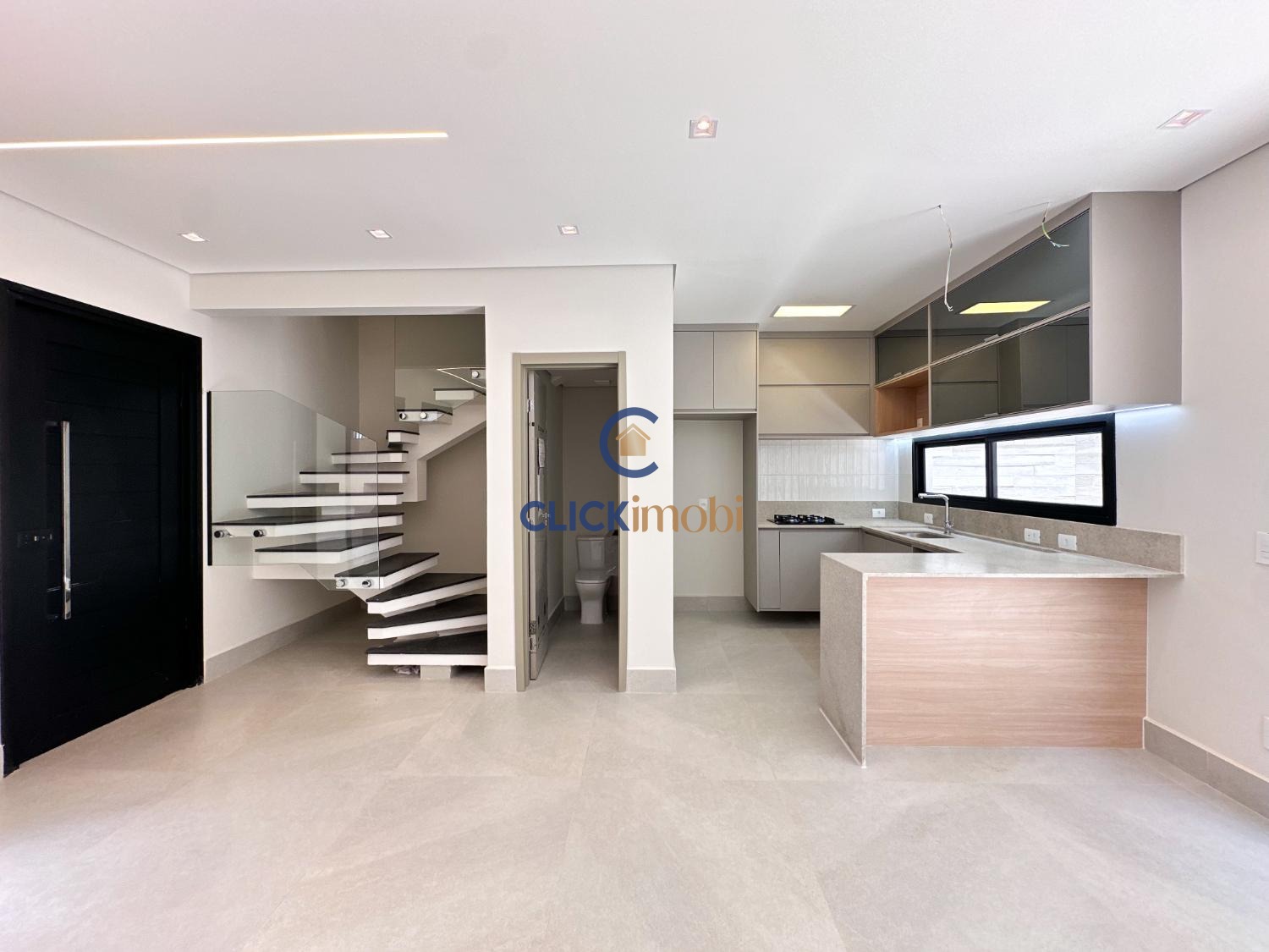 Sala ampla, cozinha e quintal no piso térreo.