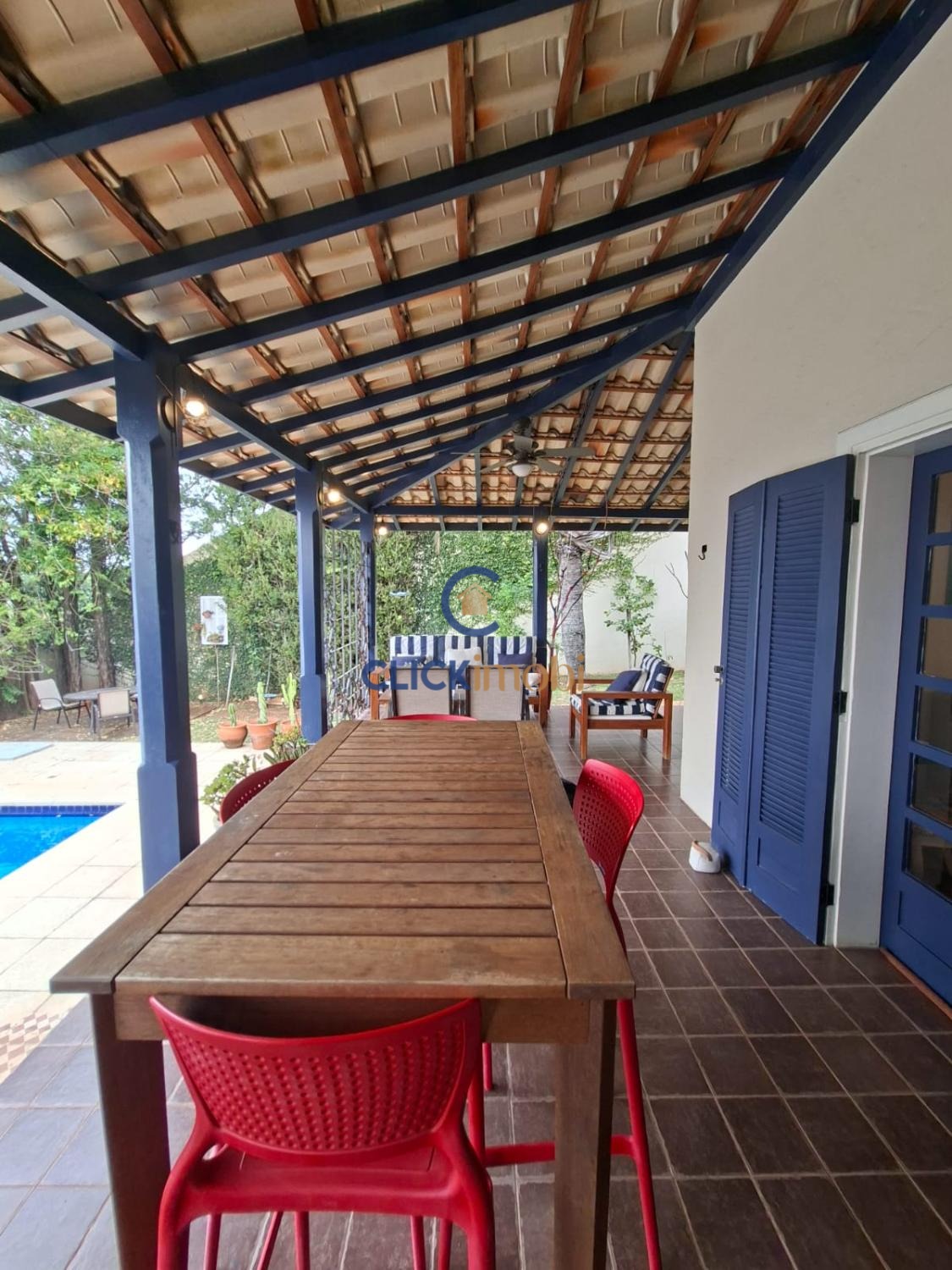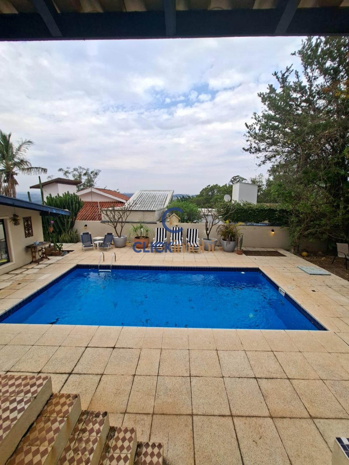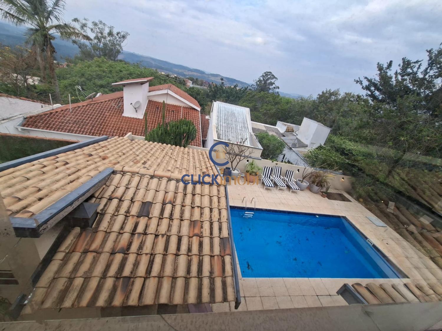 A varanda tem uma vista lindíssima da área de piscina e do horizonte.