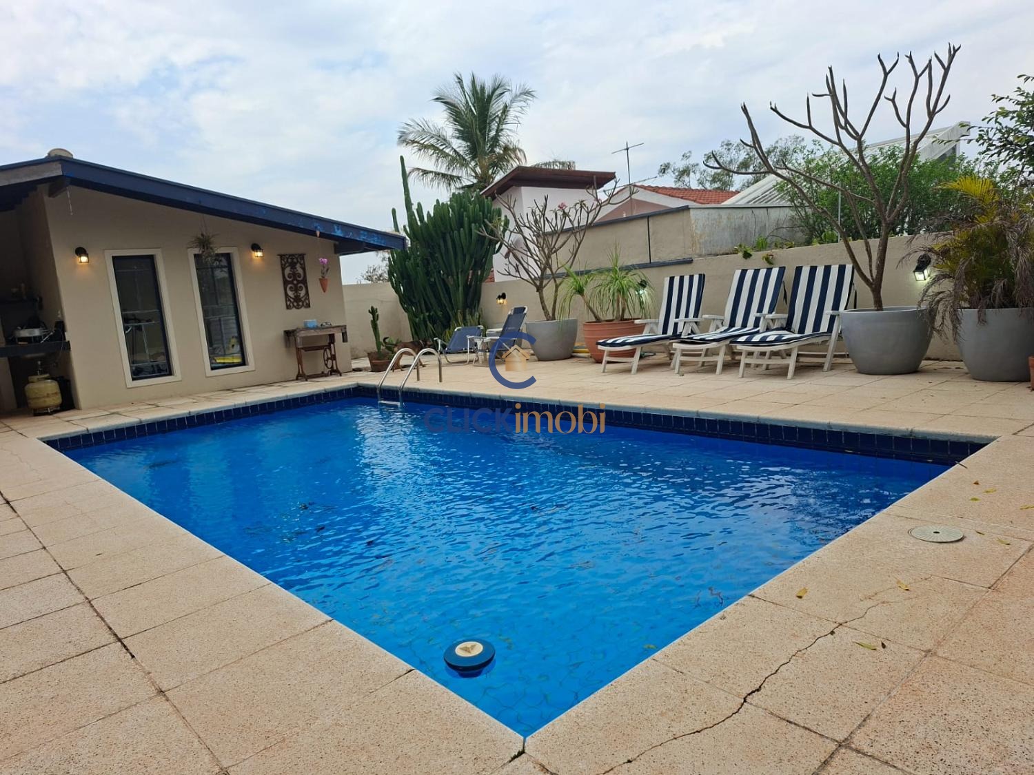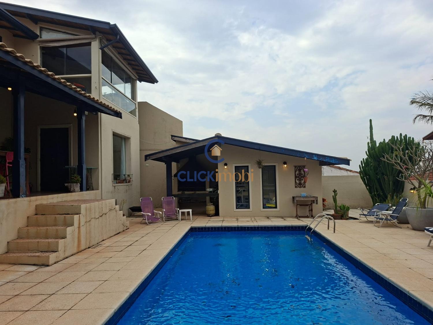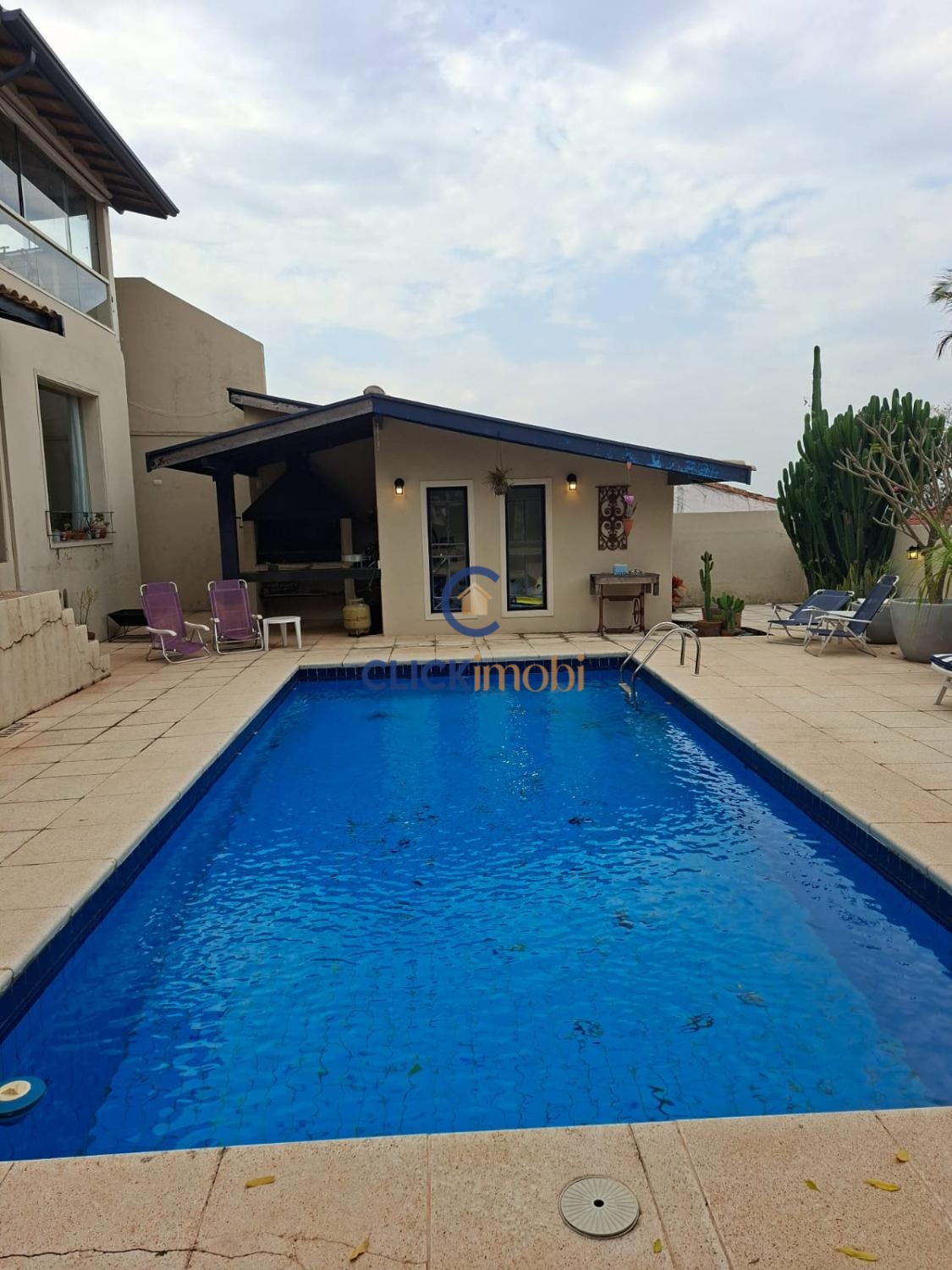 Lazer com quintal gramado com piscina e churrasqueira