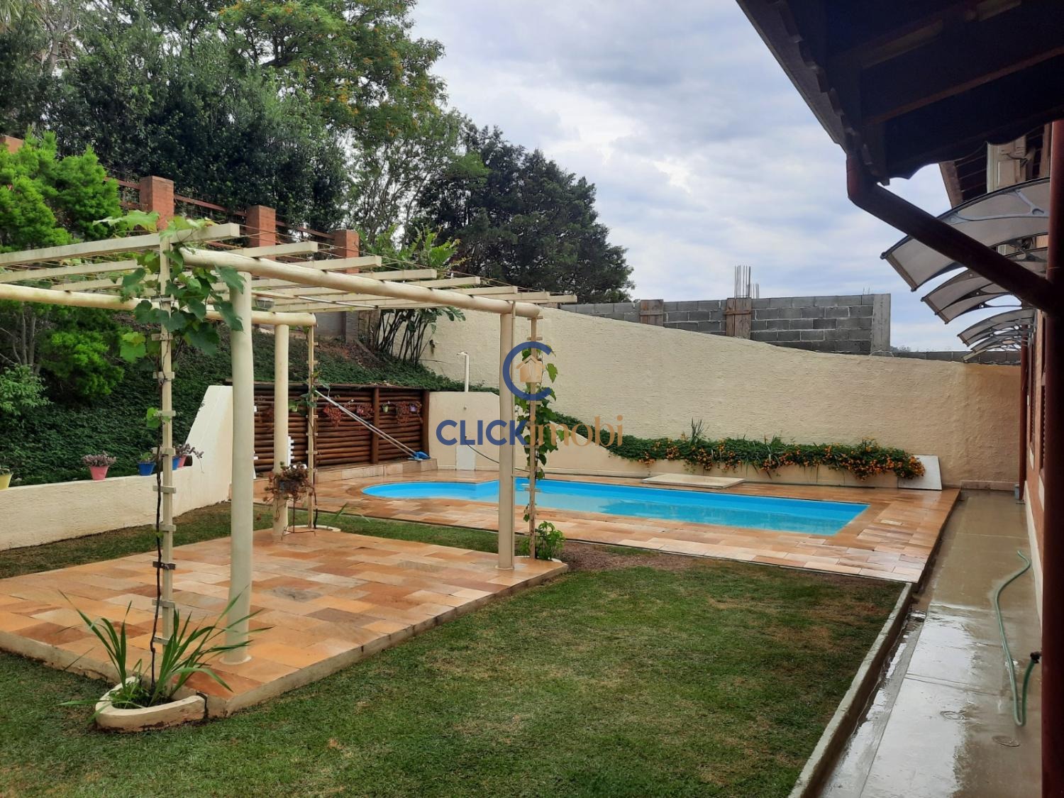 Garagem coberta para dois carros e espaço para outras garagens descobertas.